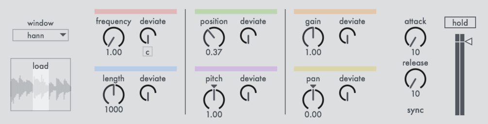 Various parameters like trigger frequency, grain length, sample position, pitch and panning can be set, individually.