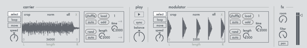 For the carrier and modulator sections, individual samples can be loaded into the corresponding buffers.The samples in both sections are looped continuously; the lengths and positions of the loops can be randomized permanently or changed manually.