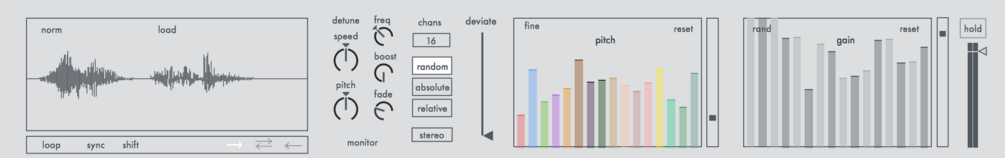The output audio signal can be distributed to up to 16 channels. The playback speed and the gain of the individual channels can be controlled individually. In addition, various randomization and scaling settings can be applied, that affect the speed, phase and pitch of the loops.